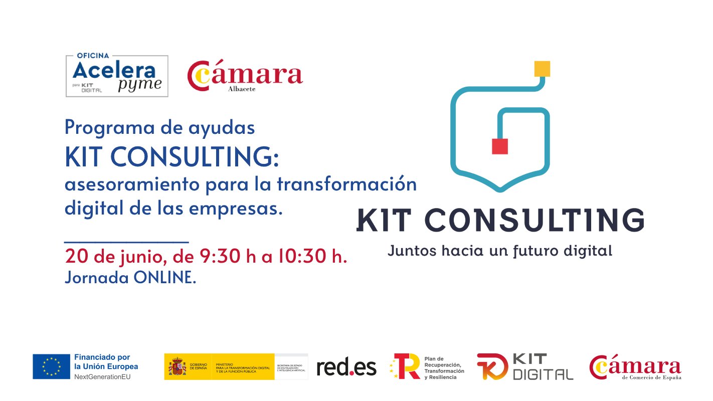 La Oficina Acelera Pyme para Kit Digital de la Cámara de Comercio de Albacete organiza una jornada ONLINE el próximo día 20 de junio de 9:30 a 10:30 con el nombre de “Programa de ayudas KIT CONSULTING: asesoramiento para la transformación digital de las empresas” donde explicaremos: