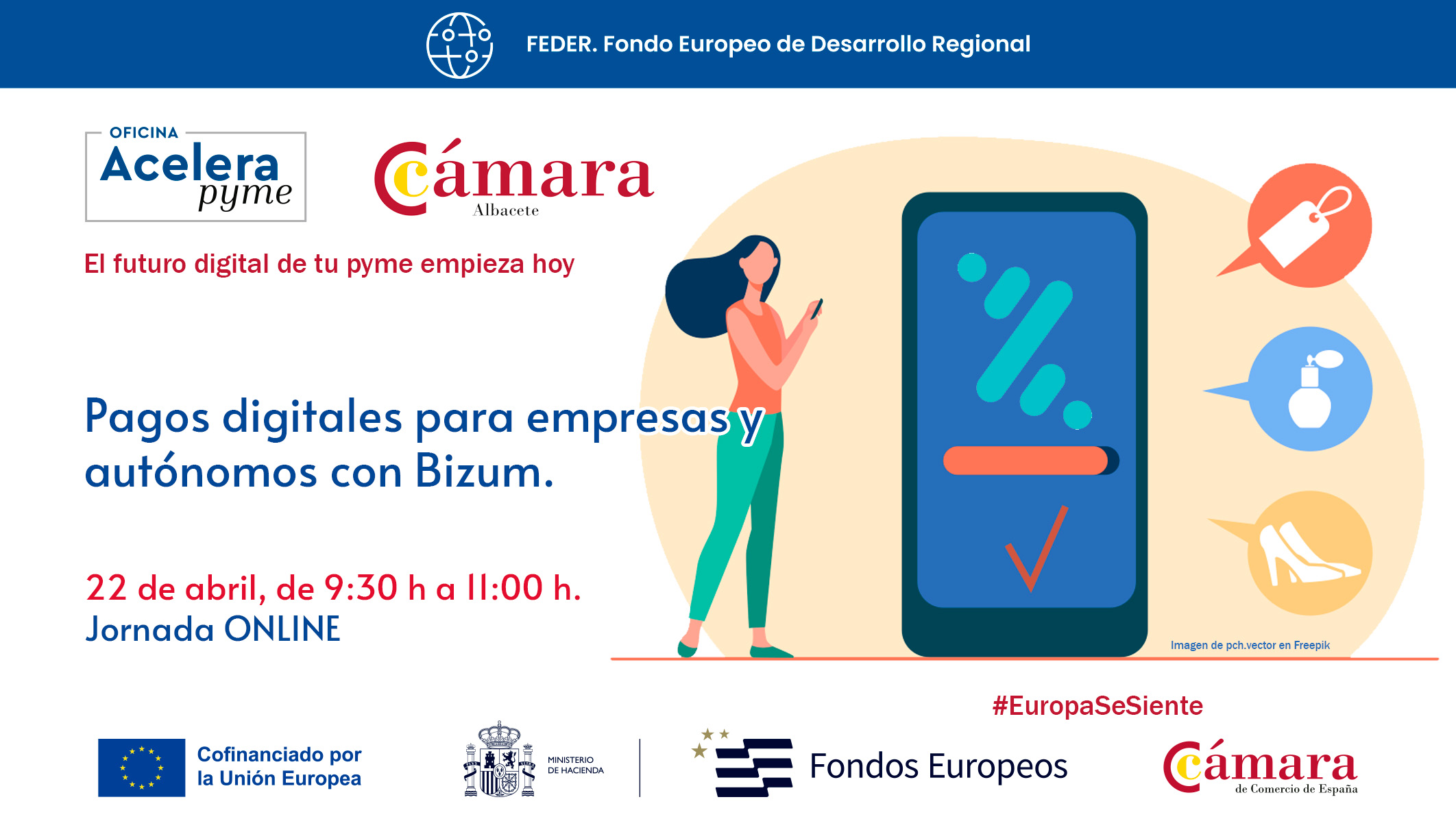 La Oficina Acelera pyme de la Cámara de Comercio de Albacete organiza una jornada online el próximo 22 de abril de 2026 con horario de 9:30 a 11:00 dirigida a autónomos y pymes donde explicaremos cómo utilizar Bizum como herramienta de cobro profesional de forma correcta, entendiendo sus ventajas, limitaciones y el marco normativo actual. El objetivo es ayudar a los asistentes a evitar errores comunes y a integrar este método de pago en su operativa diaria con seguridad.